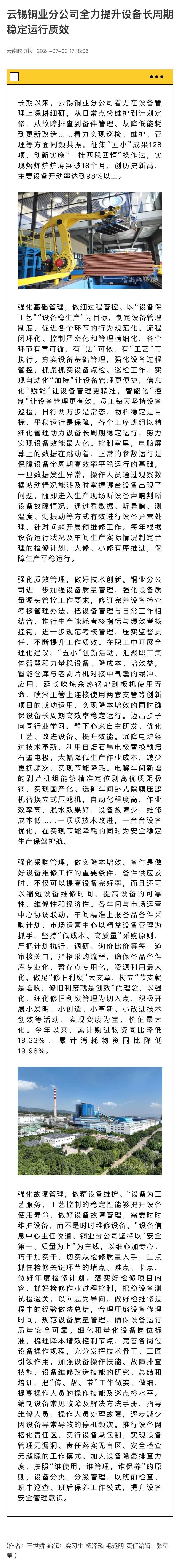ÔÆÄÏÕþЭ±¨¡¢ÓÐÉ«ÐÂÎÅ£ºÔÆÎýÍ­Òµ·Ö¹«Ë¾È«Á¦ÌáÉý×°±¸³¤ÖÜÆÚÎȹÌÔËÐÐÖÊЧ